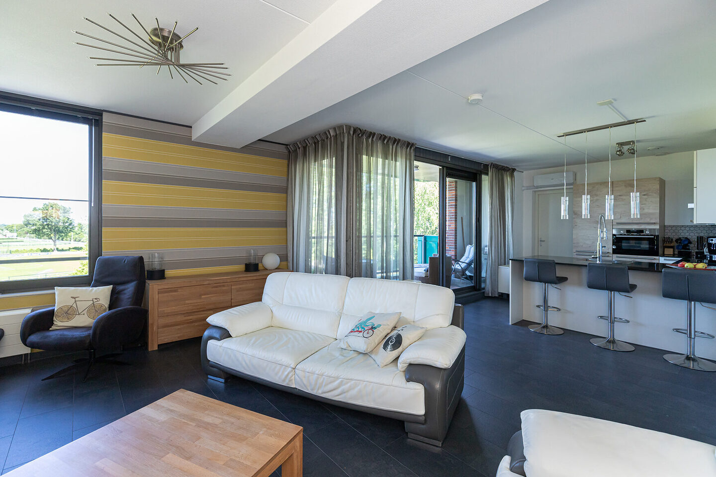 De woonkamer heeft een speelse en lichte indeling met grote raampartijen en vrij uitzicht. De ruimte sluit naadloos aan op de open keuken en biedt via een schuifpui toegang tot het balkon. De airconditioning zorgt voor een aangenaam klimaat.