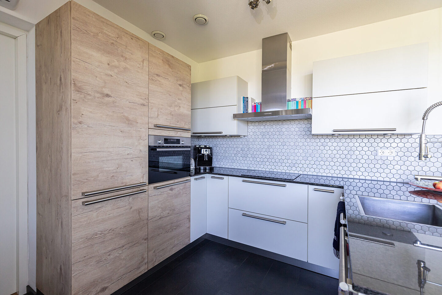 De keuken in U-opstelling beschikt over een verlengd werkblad dat tevens dienstdoet als ontbijtbar. De combinatie van stonekleurige en eikenlook fronten met een granieten werkblad in teak black geeft de keuken een moderne, warme uitstraling. De keuken is voorzien van een keramische kookplaat, afzuigkap, combimagnetron (2025), vaatwasser en koel-vriescombinatie.