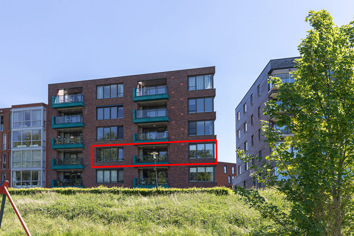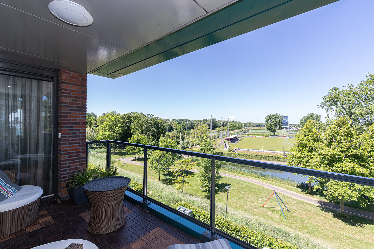 Het balkon op het noordwesten biedt vrij uitzicht over een groen park en is een heerlijke plek om te ontspannen in de middag- en avondzon.