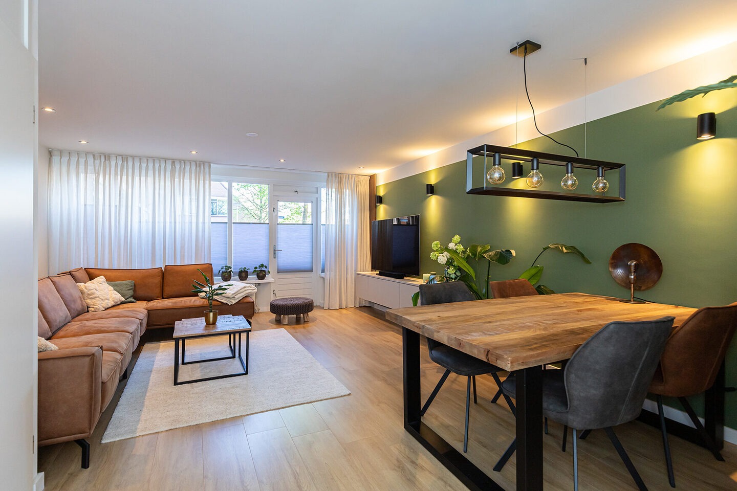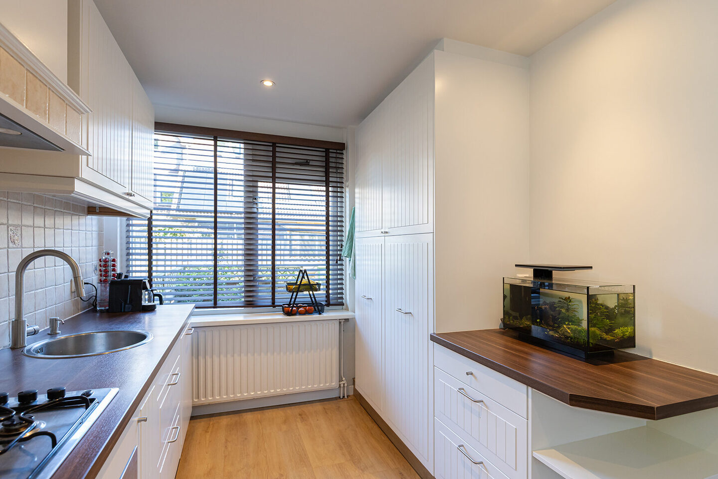 De begane grond is ingericht met een woonkamer en een open keuken. De woonkamer beschikt over grote raampartijen, wat zorgt voor een goede daglichttoetreding. De open keuken is voorzien van diverse inbouwapparatuur en biedt voldoende ruimte voor dagelijks gebruik. Het plafond in zowel de woonkamer als de keuken is afgewerkt met inbouwspots. Daarnaast bevindt zich op deze verdieping een separaat toilet.