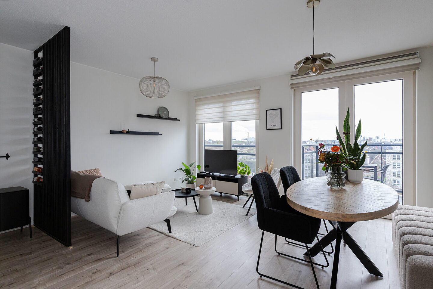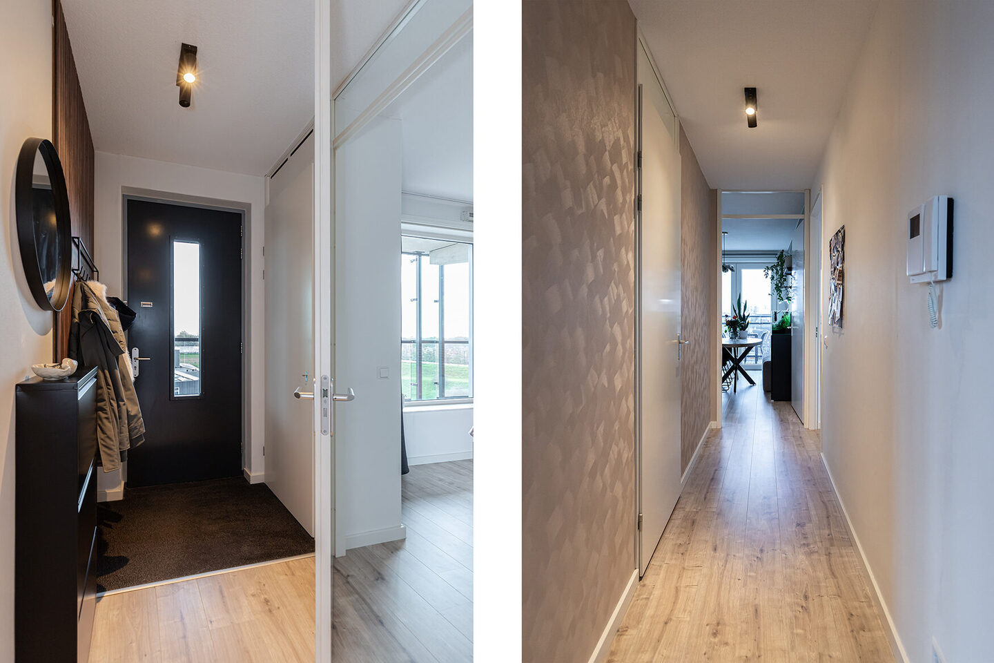 Binnen in het appartement valt de ruime hal op, die toegang biedt tot vrijwel alle vertrekken. De laminaatvloer loopt vloeiend door naar de woonkamer, waar de brede openslaande deuren naar het balkon het zonlicht royaal binnenlaten. Het balkon ligt op het zuidwesten en vormt een heerlijke verlenging van de woonkamer. De openslaande deuren naar het Franse balkon versterken het gevoel van licht en ruimte.