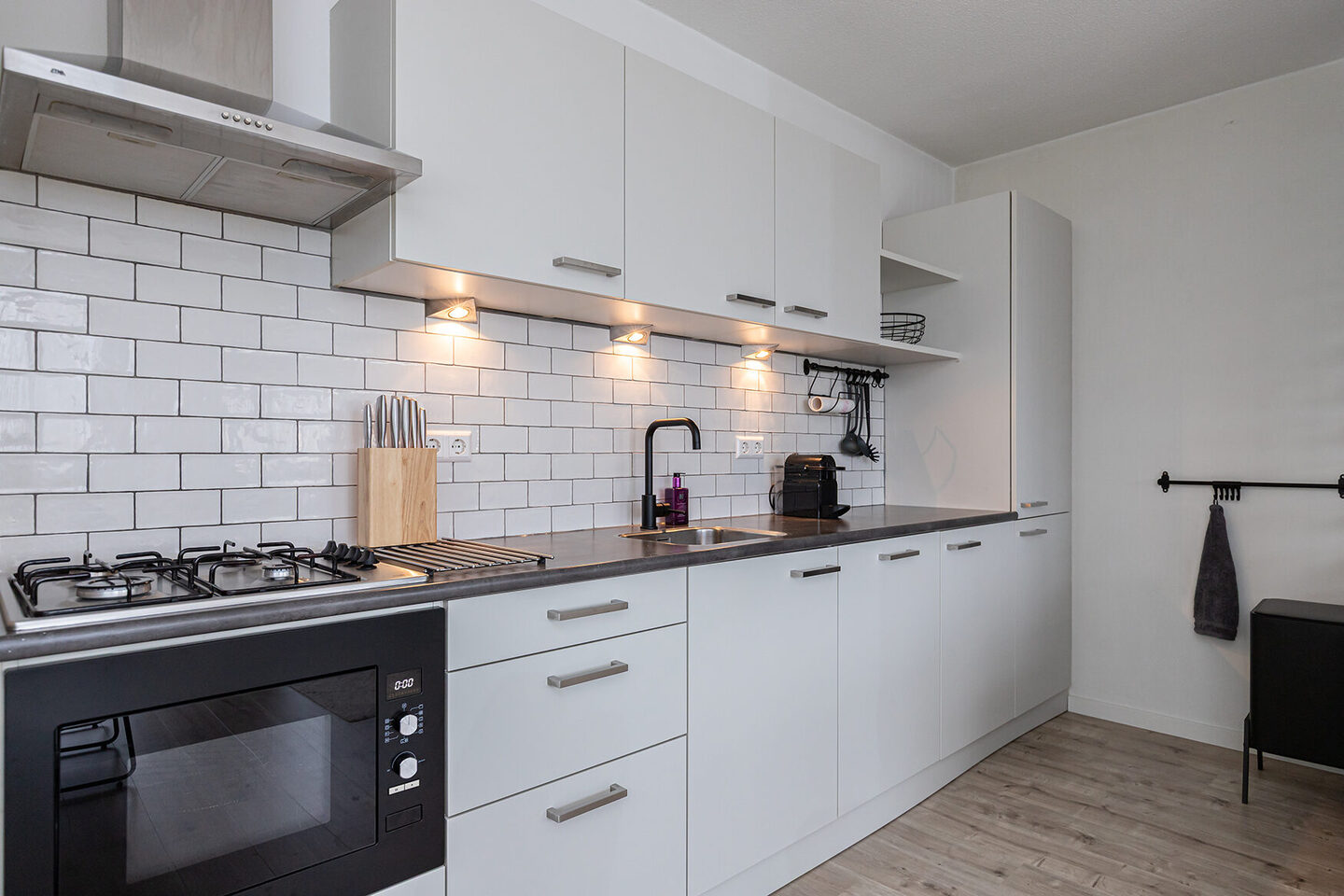De open keuken is een Tieleman-keuken uit 2015, uitgevoerd met witte kastfronten en een donker werkblad, compleet met alle gewenste apparatuur zoals een gaskookplaat, combimagnetron, vaatwasser, koel-vriescombinatie en afzuigkap.