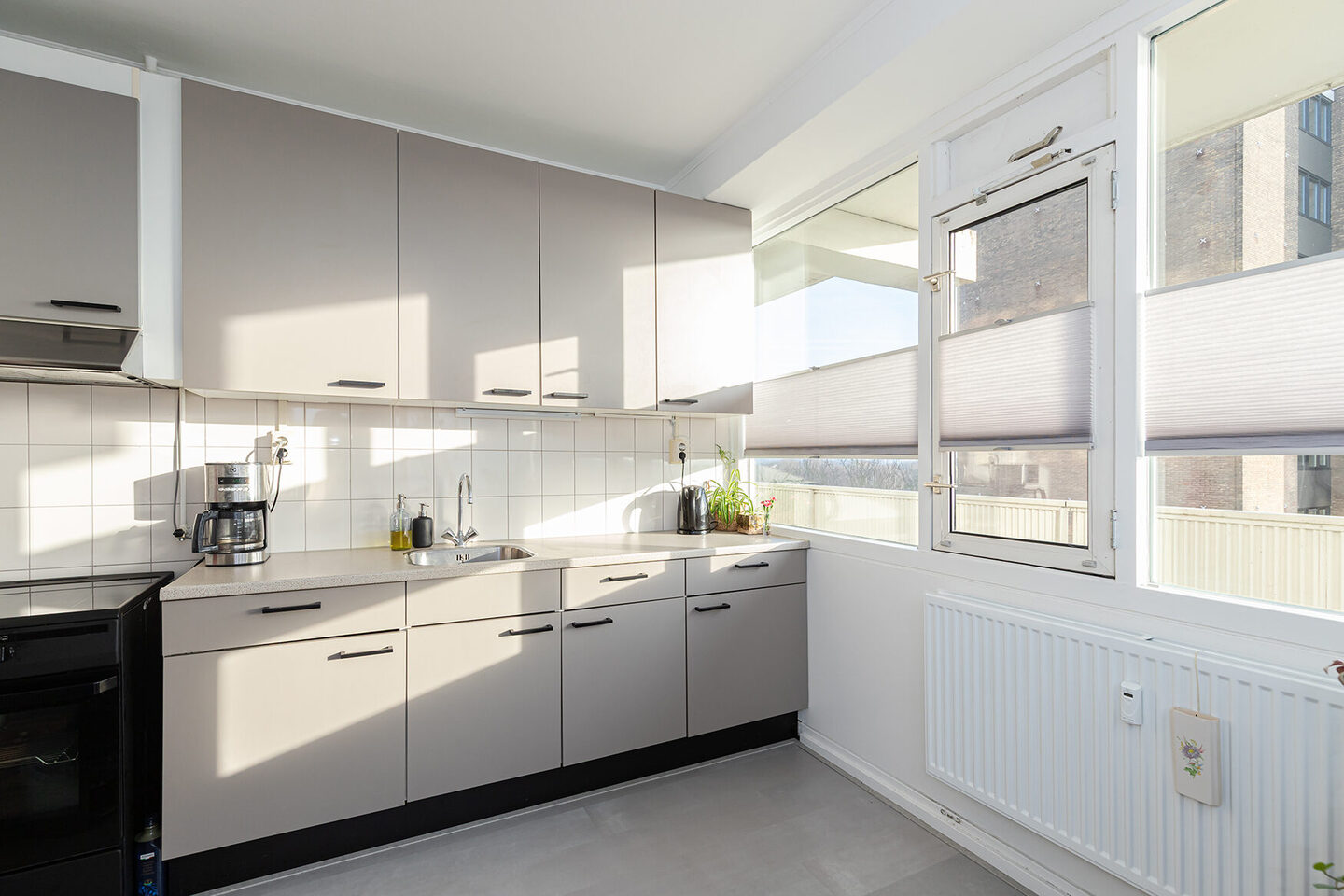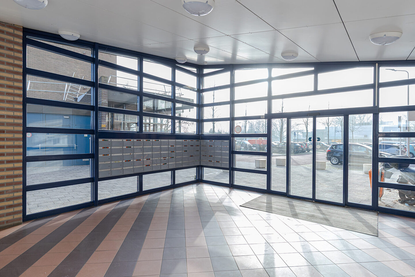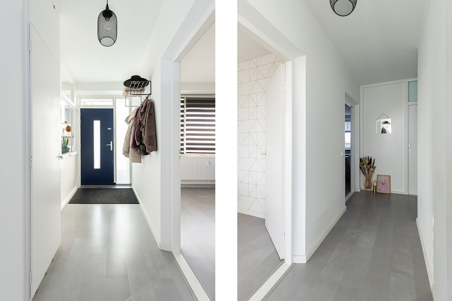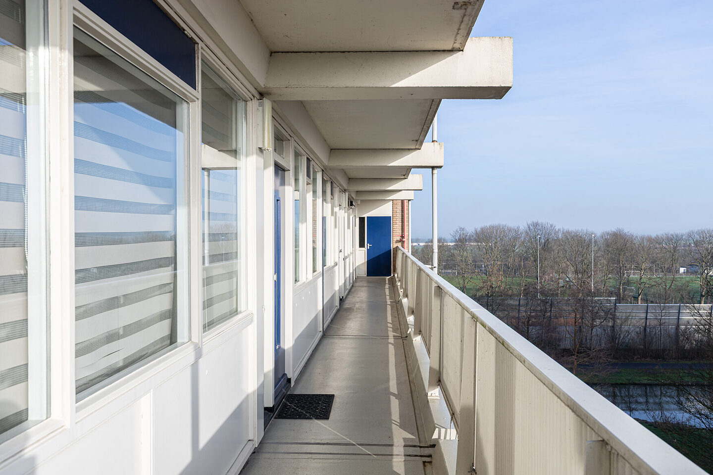 Via de lift bereik je de galerij en stap je binnen in een prettige entree die toegang biedt tot vrijwel alle vertrekken. De woning is afgewerkt met een lichtgrijze laminaatvloer die doorloopt in nagenoeg het gehele appartement en zorgt voor een rustige, eigentijdse basis. De wanden zijn strak afgewerkt, wat het geheel een frisse en verzorgde uitstraling geeft.