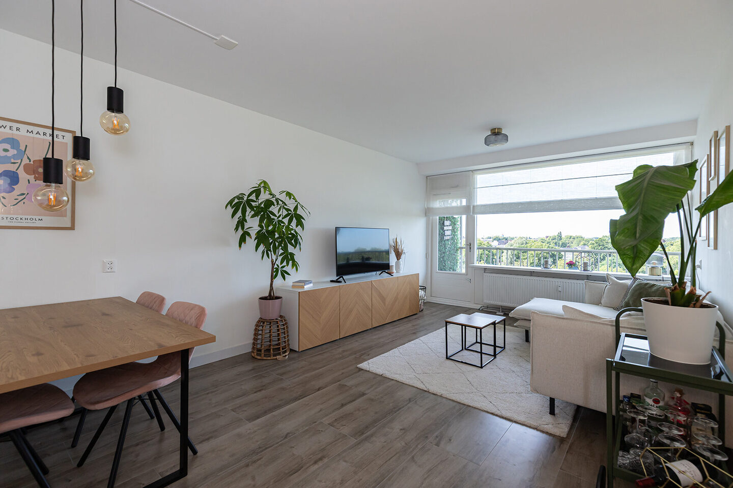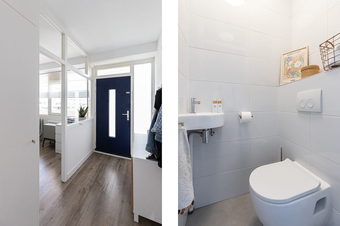 Door het hele appartement ligt een mooie laminaatvloer, de wanden zijn strak gestuukt – elke ruimte voelt fris, licht en verzorgd. In de badkamer is gekozen voor een luxe uitstraling: lichtgrijze vloertegels op de vloer, heldere witte wandtegels en een glazen douchedeur in zwart, die de ruimte extra karakter geeft. De wastafelmeubel met waskom maakt het beeld helemaal af.