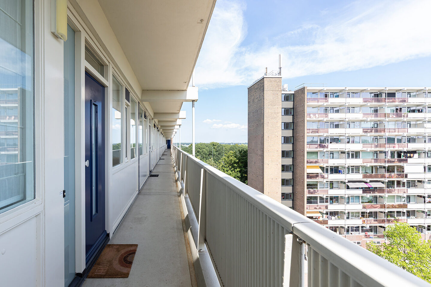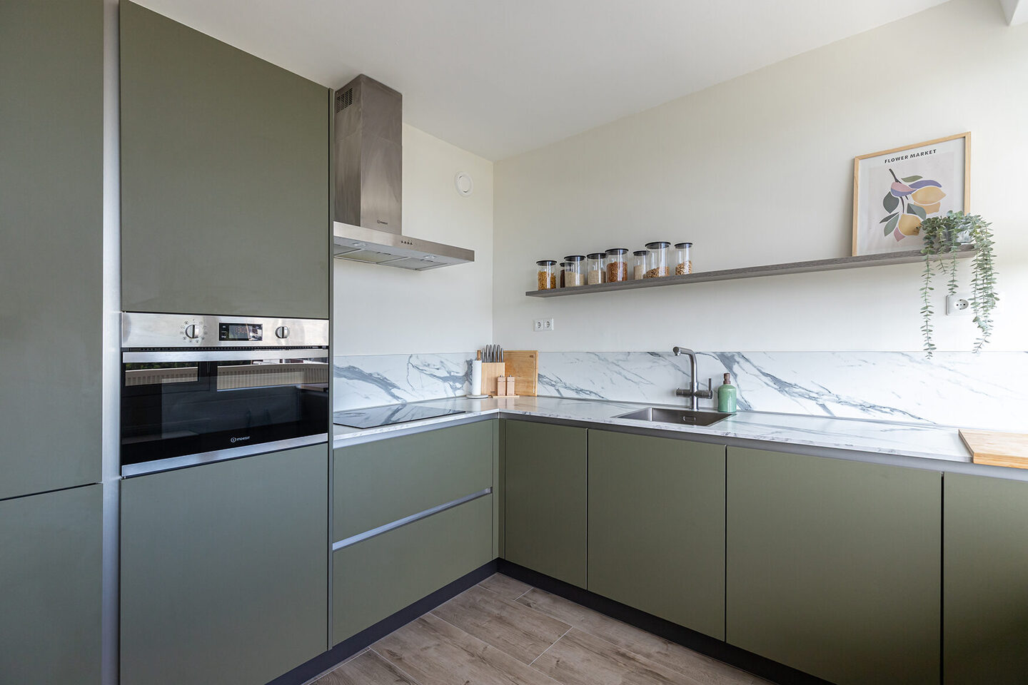 Het appartement is bereikbaar via een lift en via de galerij stap je binnen in een lichte entree die je meteen een gevoel van rust geeft. Vanuit deze entree heb je toegang tot vrijwel alle vertrekken. De keuken, volledig vernieuwd in 2021, valt op met zijn stijlvolle L-vormige opstelling in een stoere, rijke groene kleur. Voorzien van alle moderne gemakken: inductiekookplaat, afzuigkap, vaatwasser, koelkast, vriezer, heetwaterkraan en een combimagnetron.