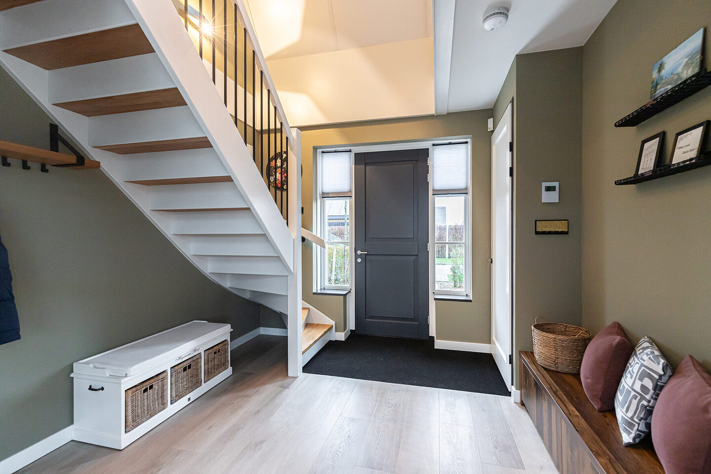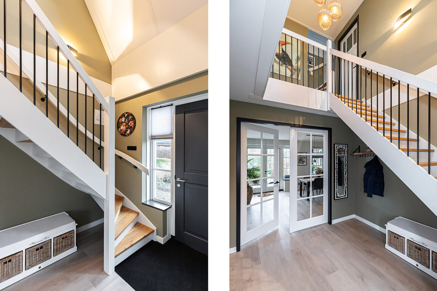De stijlvolle entree verwelkomt u met een indrukwekkende trappartij en vide die meteen het ruimtelijke karakter van de woning onderstrepen. Er is volop ruimte voor een garderobe en via de klassieke voordeur met zijramen betreedt u de woning. Dubbele openslaande deuren met roedeverdeling geven toegang tot de woonkamer.