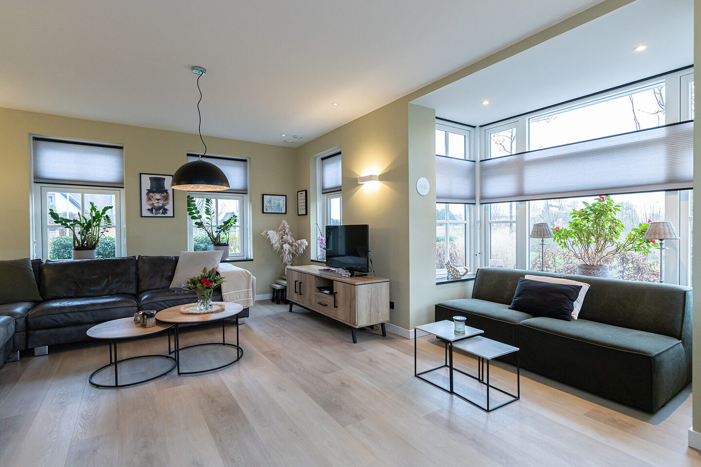 De riante woonkamer profiteert optimaal van de royale perceelgrootte: rondom veel glas, vrij zicht op het groen en een sterke verbinding met buiten. De sfeervolle erker en de openslaande deuren naar de veranda zorgen voor een prachtige lichtinval. De veranda, vrijwel volledig uitgevoerd in glas met schuifbare panelen en een glazen dak, is dankzij de ligging op het zuidwesten een heerlijke plek waar u vanaf het vroege voorjaar tot diep in het najaar kunt ontspannen en genieten van het uitzicht over de tuin.