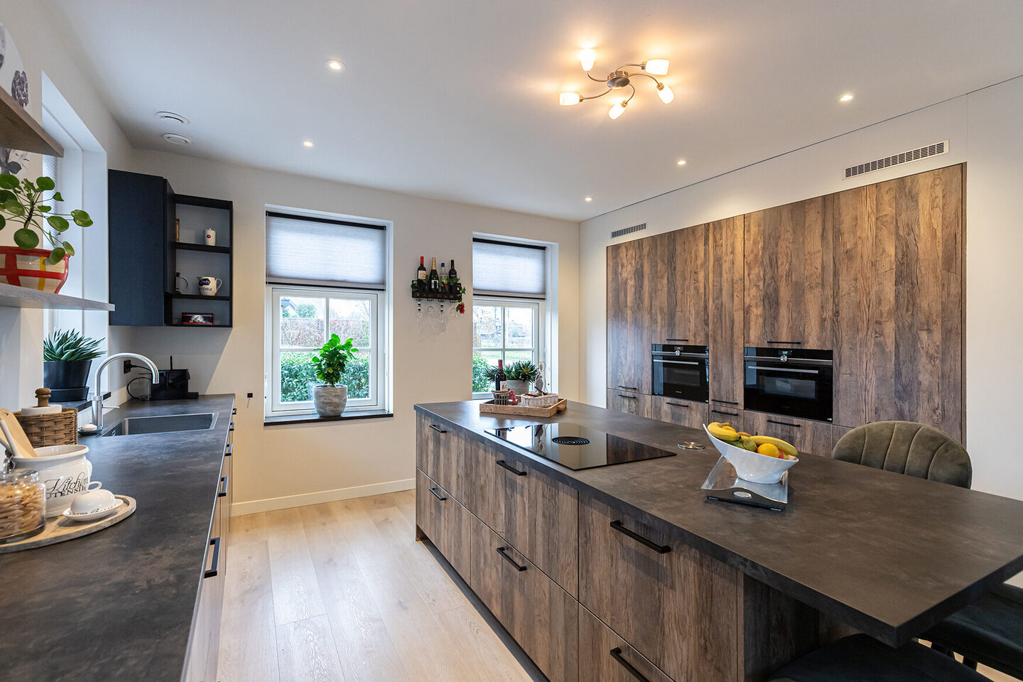 De woonkamer biedt alle ruimte voor meerdere zitopstellingen en een royale eettafel, perfect voor lange avonden met familie en vrienden. Aansluitend bevindt zich de luxe open keuken met een stoere houten keukeninrichting en een kookeiland met zitgelegenheid. Een uitnodigende plek voor gezelschap tijdens het koken of de snelle maaltijd. De keuken is compleet uitgerust met hoogwaardige inbouwapparatuur, waaronder een oven, magnetron, stoomoven, koelkast, vriezer, vaatwasmachine, Bora kookplaat en Quooker. De strak in de wand verwerkte apparatenwand en de combinatie van houten fronten met antracietkleurige werkbladen geven de keuken een krachtige, moderne uitstraling. Ook hier zorgen vele ramen voor licht en zicht op de tuin.