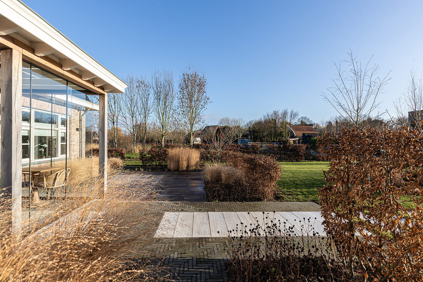 De achtertuin is een absolute eyecatcher en weerspiegelt perfect de zeldzame omvang van het perceel. Met een groot gazon, fraaie zichtlijnen, sierbestrating en strategisch geplaatste hagen en bomen biedt de tuin uitzonderlijk veel privacy, rust en ruimte. Het royale terras grenst direct aan de serre en vormt een natuurlijke verlenging van de woonruimte. De gevarieerde beplanting, siergrassen, bloembedden en buitenverlichting maken dit een tuin die elk seizoen indruk maakt. De ligging op het zuidwesten zorgt voor een optimale zonligging.