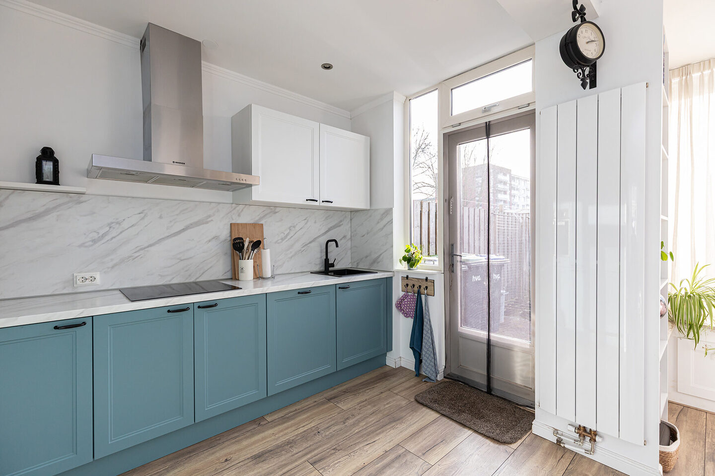 Aansluitend bevindt zich de royale open keuken, die direct in het oog springt door de frisse blauw-witte kleurstelling. De combinatie van witte bovenkastjes en blauwe onderkastjes, samen met het wit marmerlook werkblad, zorgt voor een eigentijdse uitstraling. De keuken is compleet uitgerust met moderne inbouwapparatuur en via de deur is de tuin direct bereikbaar.
