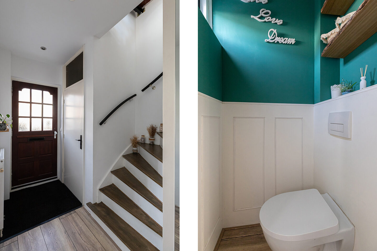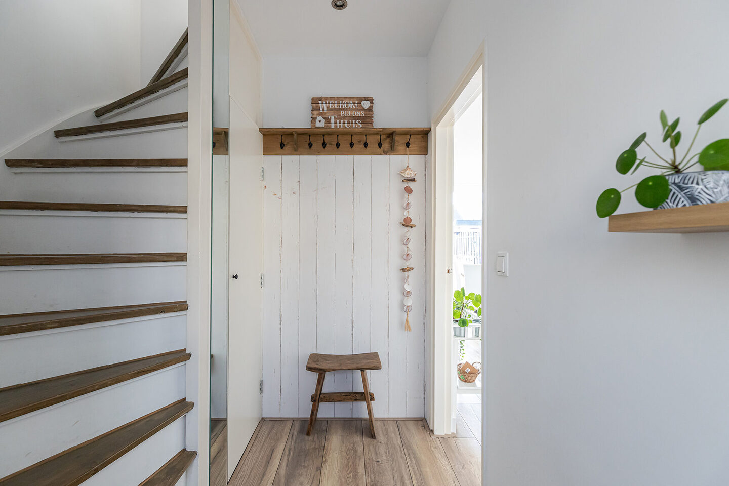 Binnen valt direct op hoe netjes en rustig de woning is afgewerkt. Vrijwel alle wanden zijn glad gestuct en de laminaatvloer geeft het geheel een warme, rustieke uitstraling. In de hal bevinden zich het toilet en de trapopgang naar de verdieping, waarbij ook de trap zelf keurig is afgewerkt met nette traptreden.