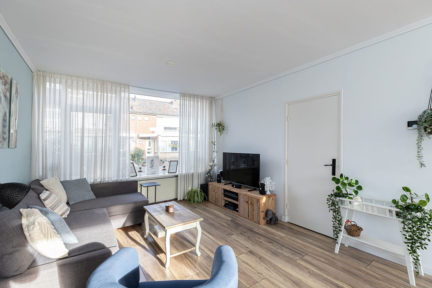 De doorzonwoonkamer is heerlijk licht en biedt volop leefruimte. In de woonkamer is slim omgegaan met de installaties: de leidingen zijn netjes weggewerkt in maatwerkkastruimte, terwijl de radiatoren strak en verticaal aan de wand zijn geplaatst. Dit zorgt niet alleen voor een rustige uitstraling, maar biedt ook praktische extra bergruimte.