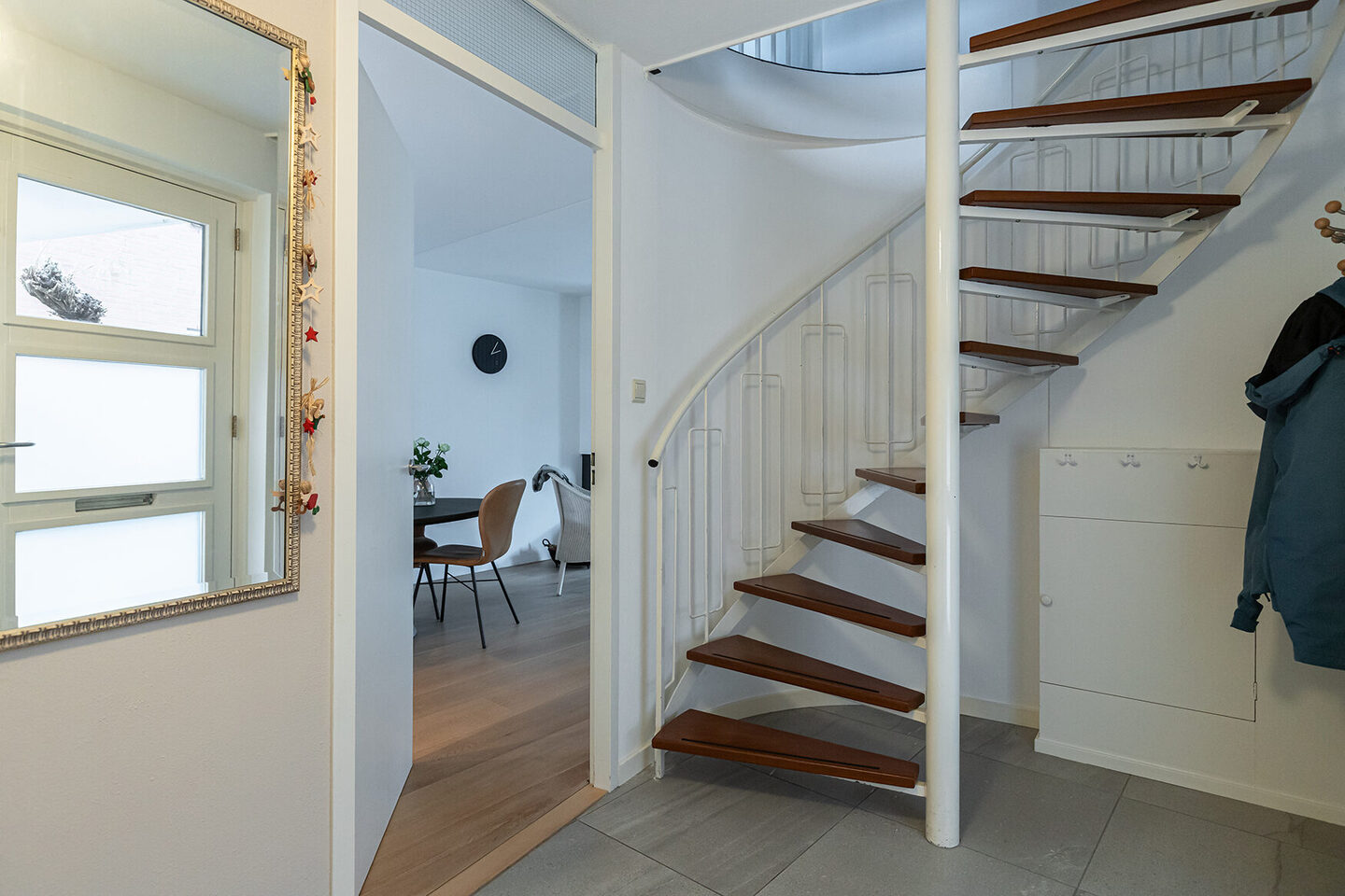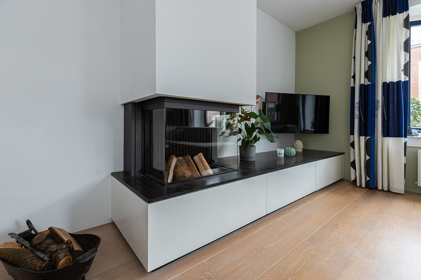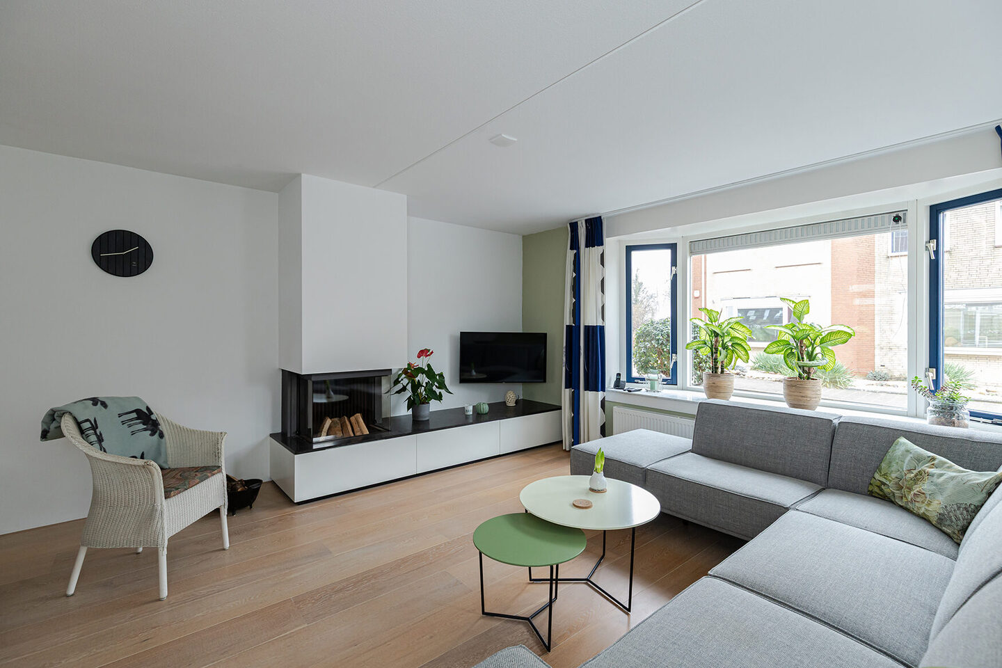 Via de entree kom je in de hal met een speelse halfronde wand, die direct karakter geeft aan het interieur. Vanuit hier zijn het moderne toilet, de meterkast, de spiltrap naar de verdiepingen en de inpandige garage bereikbaar. De woonkamer van circa 31 m² is licht en uitnodigend, met een sfeervolle erker aan de voorzijde en een houtkachel die zorgt voor warmte en gezelligheid. Grote raampartijen versterken het gevoel van ruimte en zorgen voor een oase aan licht.