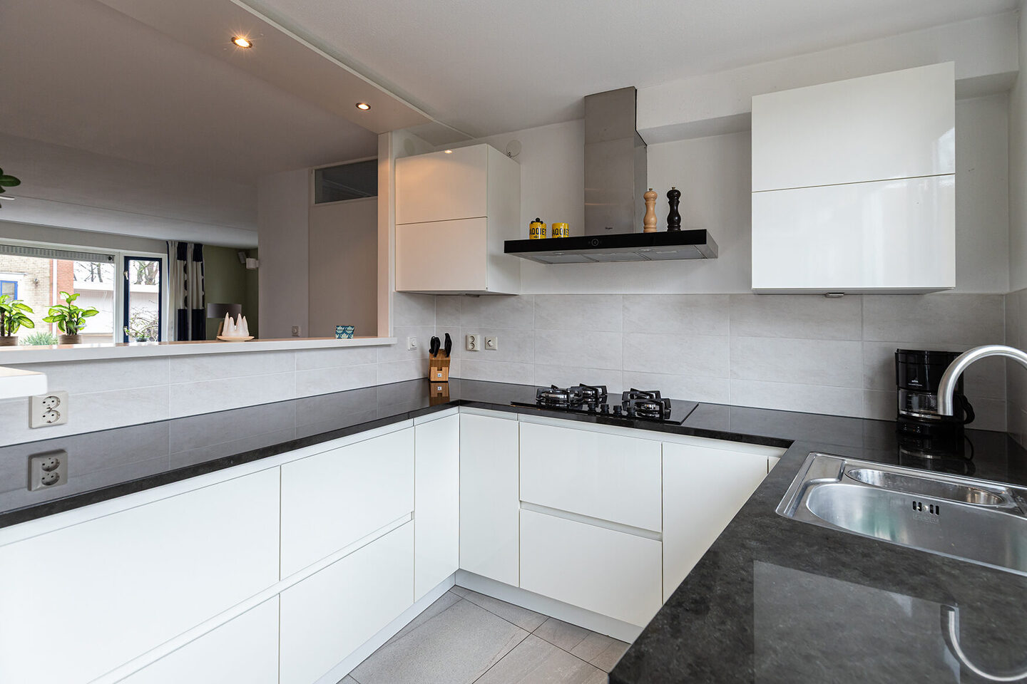 De open keuken sluit hier naadloos op aan en is uitgevoerd in een praktische U-opstelling met witte kasten en een zwart granieten werkblad. De keuken van Mandemakers is compleet uitgerust met diverse inbouwapparatuur en biedt volop werk- en bergruimte. De achterdeur geeft toegang tot de tuin.