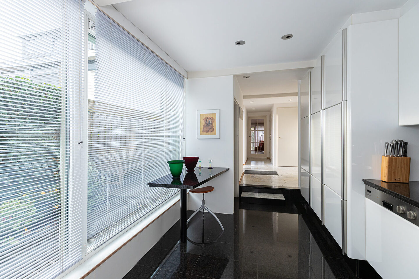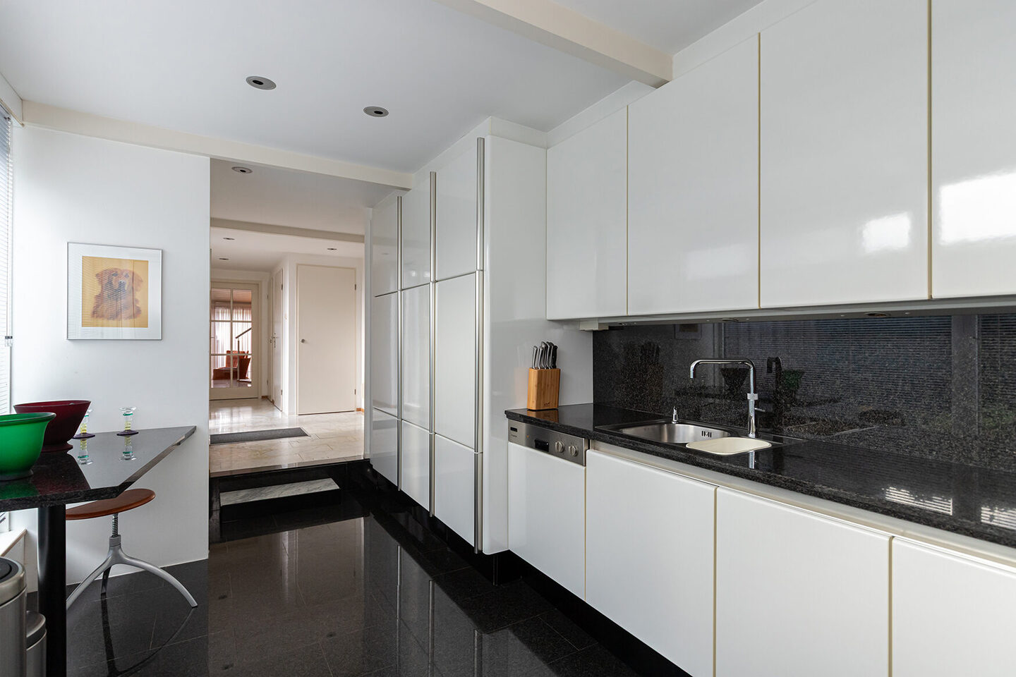 De keuken straalt moderne luxe uit: strakke witte fronten, een zwart granieten blad en alle apparatuur die je verwacht: een inductiekookplaat, oven, afzuigkap, vaatwasser, quooker, koelkast en vriezer. Aangrenzend bevindt zich de praktische wasruimte én de berging aan de voorzijde.