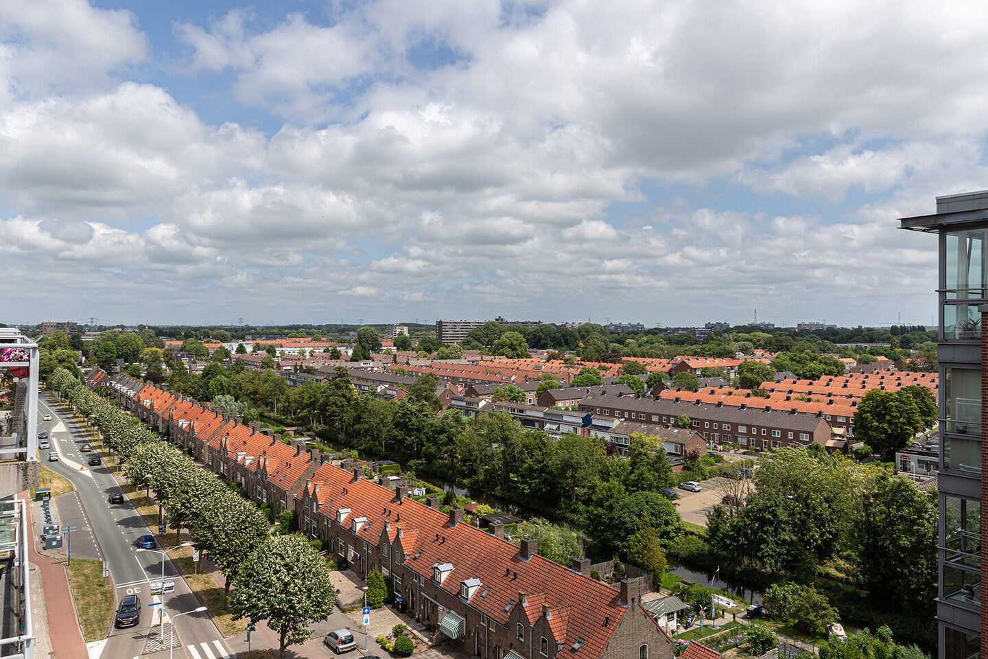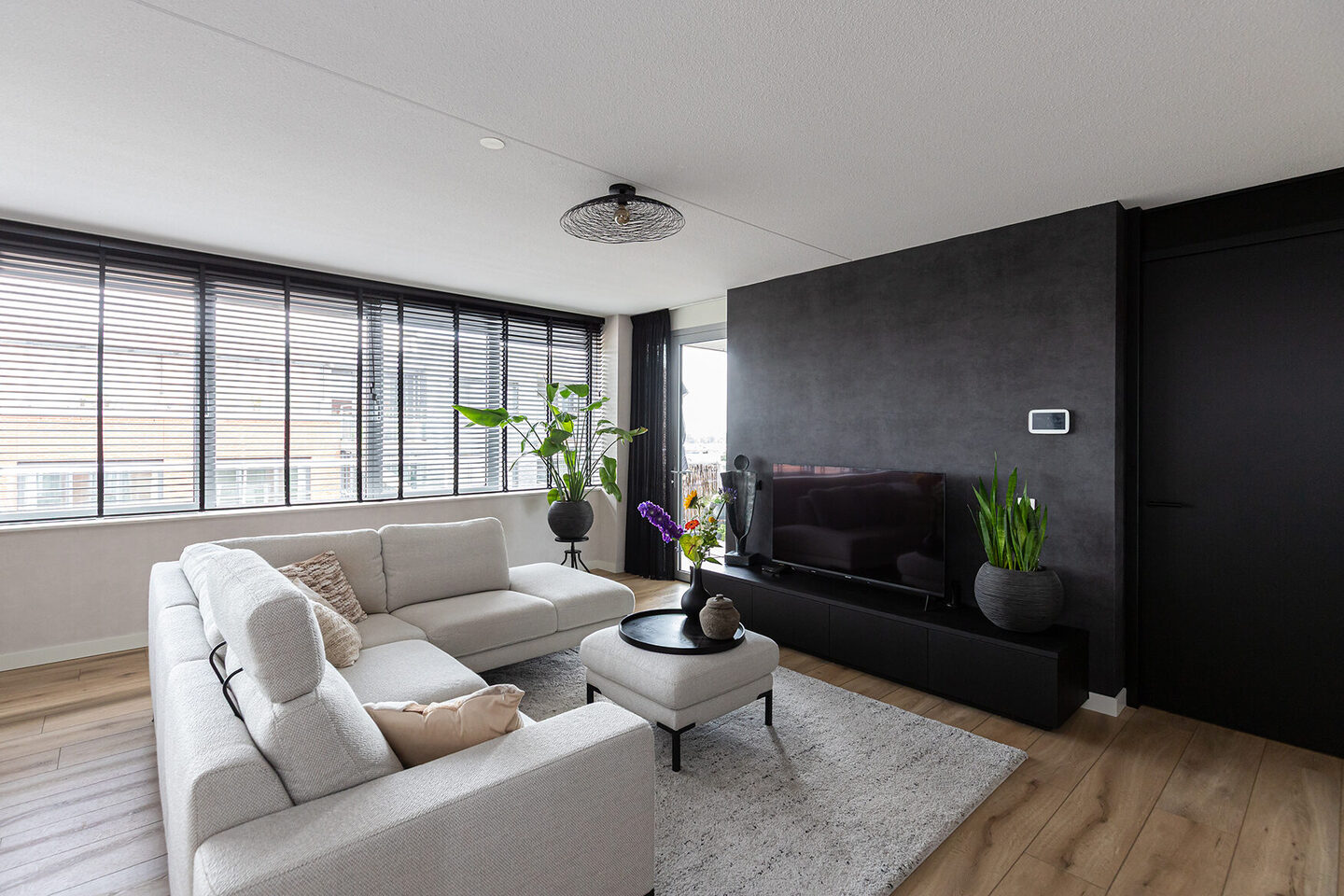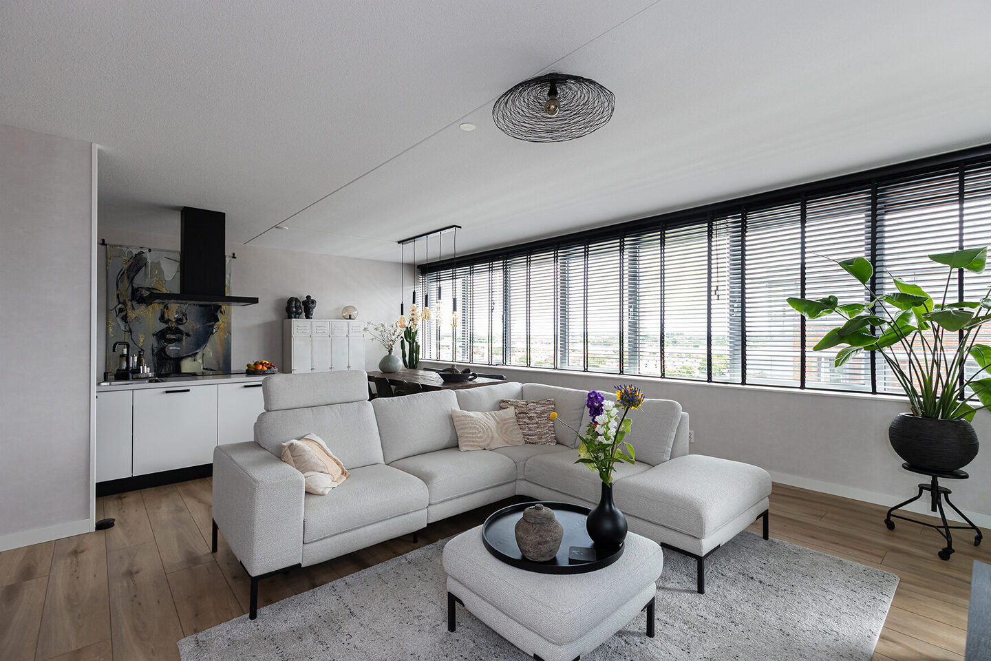 De woonkamer met open keuken strekt zich over de volledige breedte van het appartement en wordt overspoeld door natuurlijk daglicht dankzij de grote raampartijen en openslaande deur naar het balkon. Voor extra comfort en privacy zijn deze ramen voorzien van elektrisch bedienbare screens, die op warme of zonnige dagen zorgen voor een aangenaam binnenklimaat en sfeer. Vanuit hier kijk je leuk weg over het centrum en de wijde omgeving. Het balkon is grotendeels overdekt en perfect georiënteerd op het oosten – een heerlijke plek voor een ontspannen ontbijt in de ochtendzon.