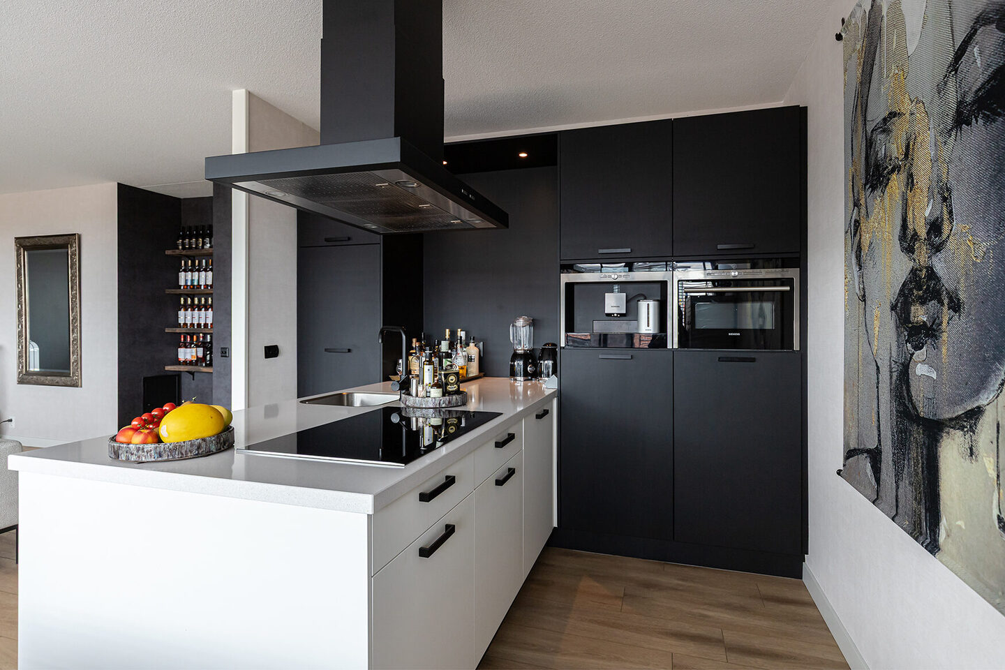 De open keuken vormt een stijlvolle blikvanger in de ruimte en is uitgevoerd in een zwart-witte kleurstelling. De keuken is uitgerust met hoogwaardige inbouwapparatuur van Siemens StudioLine, waaronder een inductiekookplaat, combimagnetron, koelkast en een ingebouwd koffiezetapparaat. De vaatwasser van Bosch maakt het geheel compleet. In de bijkeuken, annex berging vind je een vrijstaande koel-vriescombinatie. Deze blijft eveneens achter.
