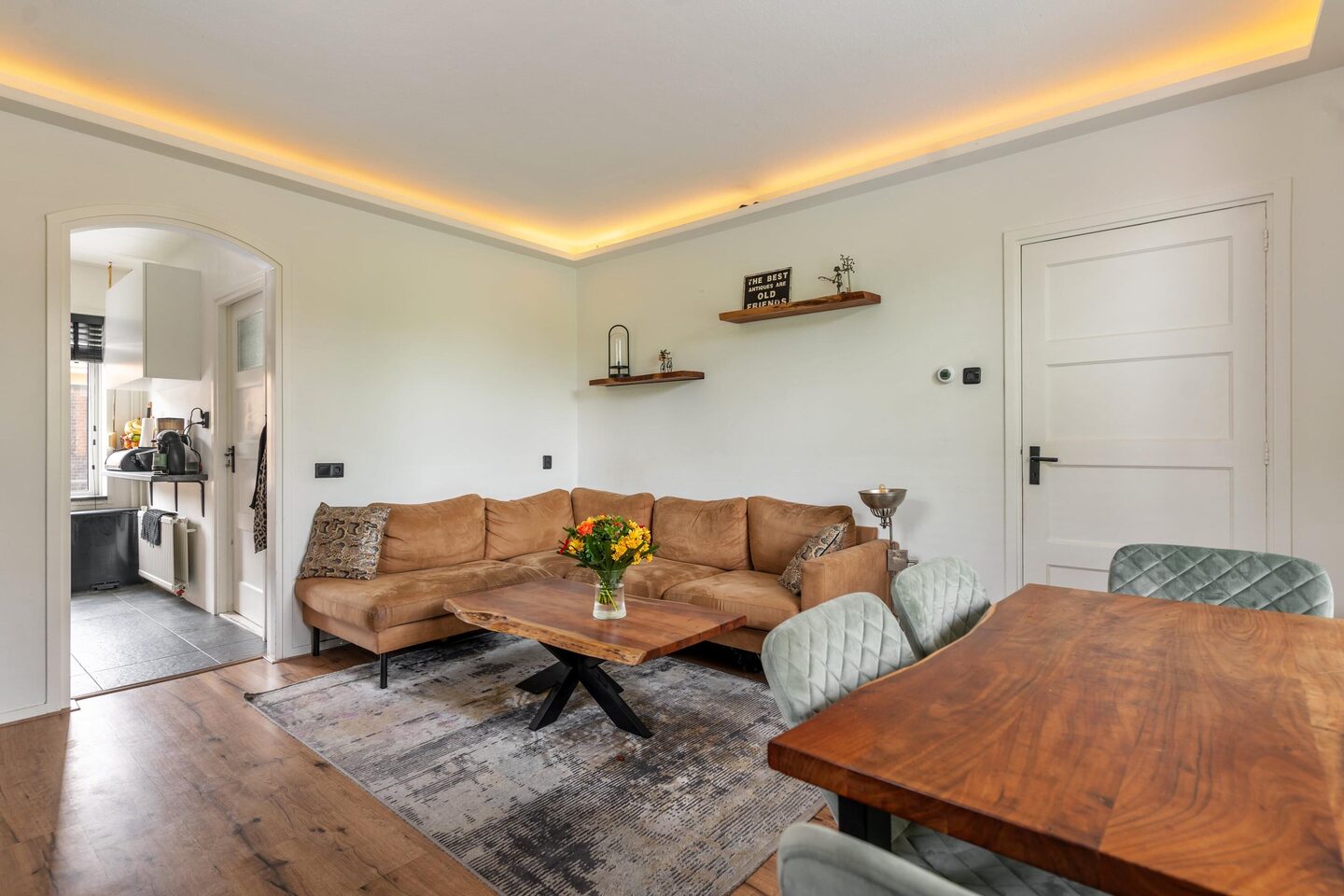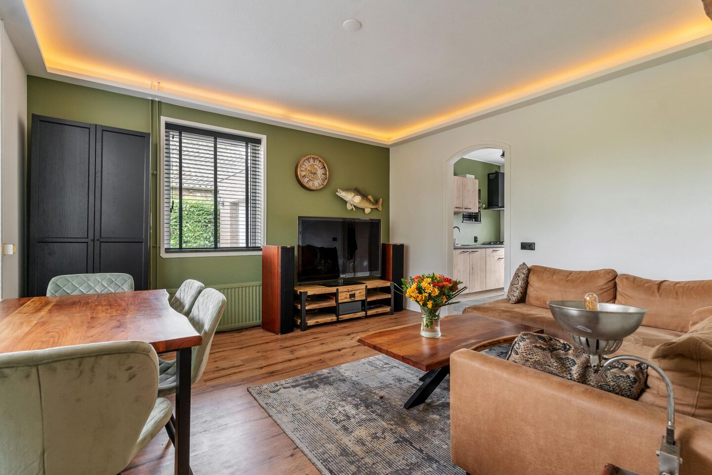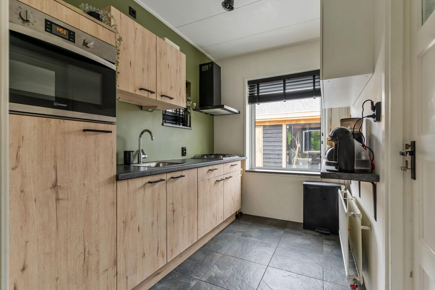 Via de hal kom je in de sfeervolle woonkamer, waar de lichtinval en warme uitstraling direct voor een huiselijk gevoel zorgen. De halfopen keuken sluit hier naadloos op aan en is enkele jaren geleden vernieuwd met stijlvolle eikenhouten kasten en een donkergrijs werkblad. Dankzij de praktische indeling en ingebouwde apparatuur kook je hier met plezier. Aansluitend vind je de ruime bijkeuken met volop opbergruimte, de badkamer, het toilet én de aansluitingen voor wasmachine en droger – een functioneel hart van het huis.