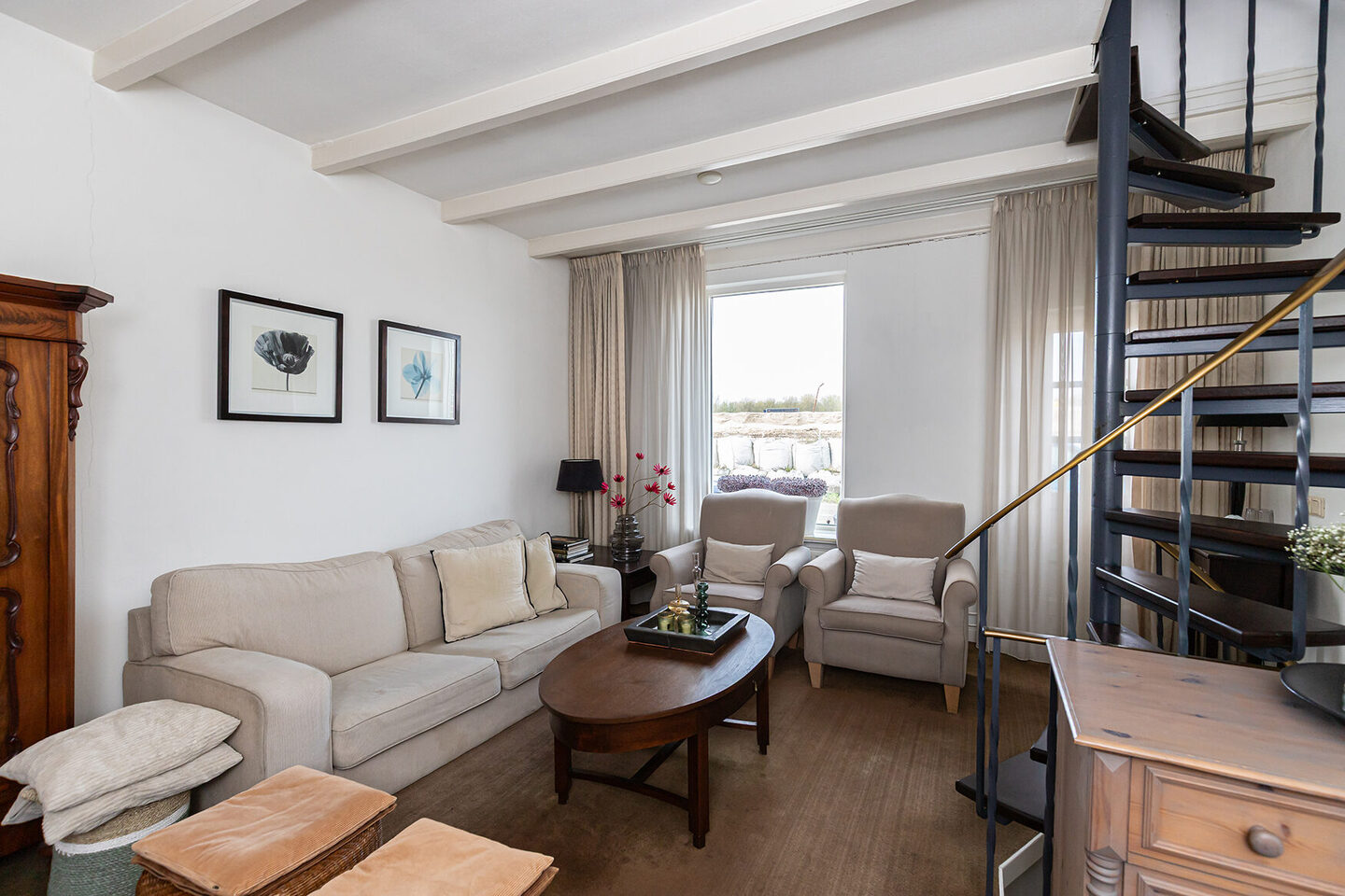 Via een spiltrap bereik je de verdieping, waar de woonkamer zich bevindt. Deze ruimte profiteert van het verhoogde niveau en biedt een fraai uitzicht over de dijk. De speelse indeling met niveauverschillen en de verbinding met de andere verdiepingen geven de woning een eigen karakter.