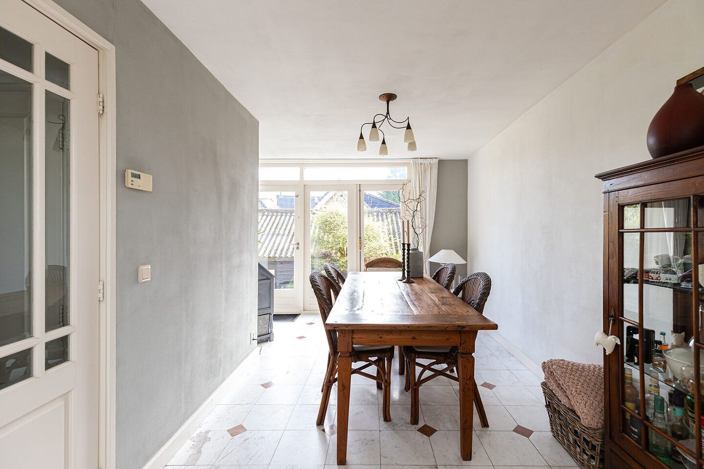 De woning kent een bijzondere indeling met het souterrain als volwaardige woonlaag. Hier kom je binnen in de hal met toegang tot de verschillende ruimtes. De woonkeuken vormt het hart van deze verdieping en is uitgevoerd in een warme camée tint met een stijlvol composieten werkblad. De keuken is compleet uitgerust met moderne inbouwapparatuur en biedt volop ruimte om te koken en samen te komen. Aansluitend bevindt zich de eetkamer, die dankzij de openslaande deuren naadloos overgaat in de tuin. Deze tuinkamer voelt licht en uitnodigend aan en vormt een heerlijke plek om te dineren met zicht op het groen.