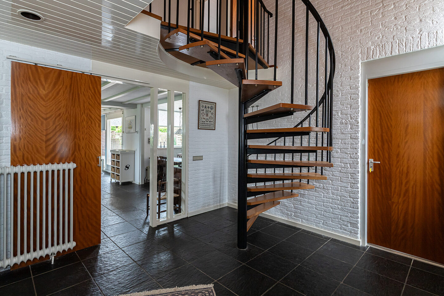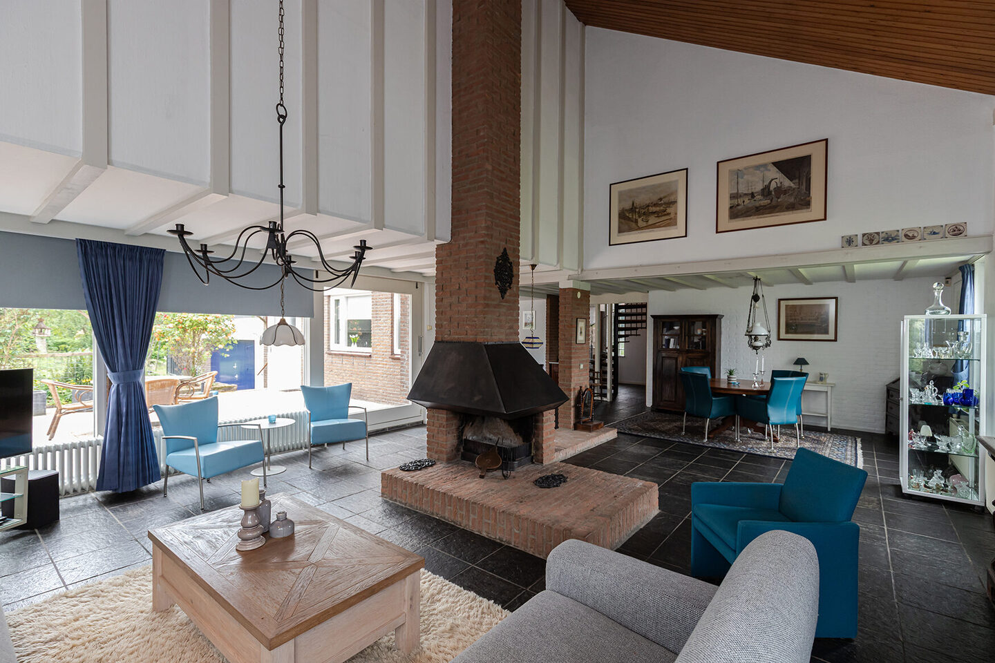 De woning zelf biedt comfort en ruimte. Bij binnenkomst via de entree tref je de meterkast. Via de centrale hal, met spiltrap naar boven, bereik je de royale L-vormige woonkamer en de hoofdslaapkamer met badkamer ensuite. De woonkamer ademt sfeer dankzij de vide die zorgt voor extra hoogte en licht, het gezellige balkenplafond en het deels houten plafond met inbouwverlichting. Grote raampartijen bieden prachtig uitzicht op het omliggende groen en laten het daglicht volop binnenstromen. Via de brede schuifpui stap je zo het terras op, waardoor binnen en buiten naadloos in elkaar overlopen.