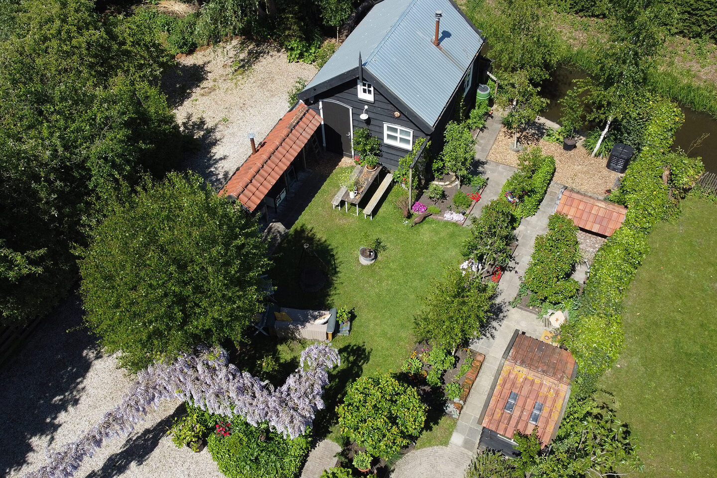 Aan het eind van de tuin vindt u een idyllisch gastenverblijf met een keukenblok, houtkachel en slaapzolder, toegankelijk via een ladder. Aan de achterzijde is een terras aan het water gerealiseerd, compleet met steiger en hekwerk. Dit tuinhuisje is bereikbaar via de overdekte steiger aan het water en via de carport.