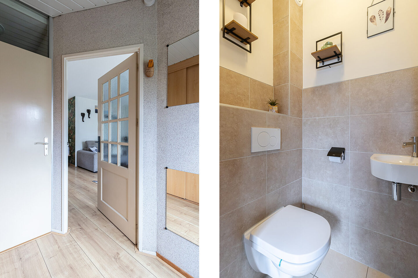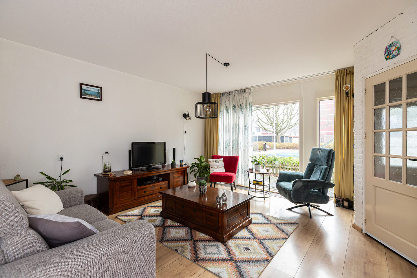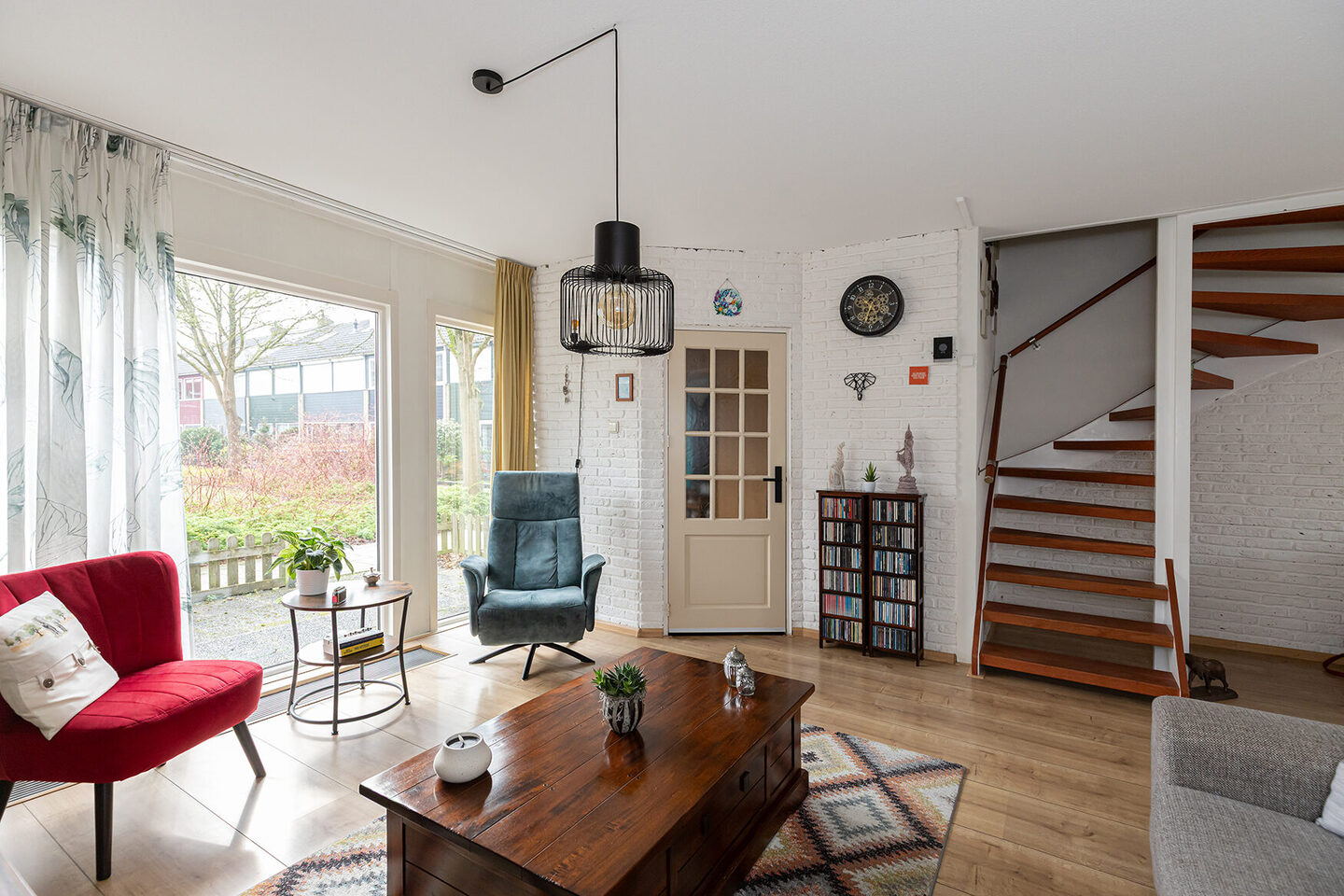 Binnen valt direct de speelse indeling op. De Z-vormige woonkamer geeft de leefruimte karakter en zorgt voor een natuurlijke verdeling tussen zit- en eetgedeelte. Grote raampartijen aan zowel de voor- als achterzijde zorgen voor optimaal daglicht, waardoor de woning licht en ruim aanvoelt. Aan de achterzijde openen de deuren naar de tuin zich als vanzelf: binnen en buiten vloeien hier naadloos in elkaar over. Op zonnige dagen vormt het terras een verlengstuk van de woonkamer – een plek om te ontspannen, te borrelen of samen te genieten.