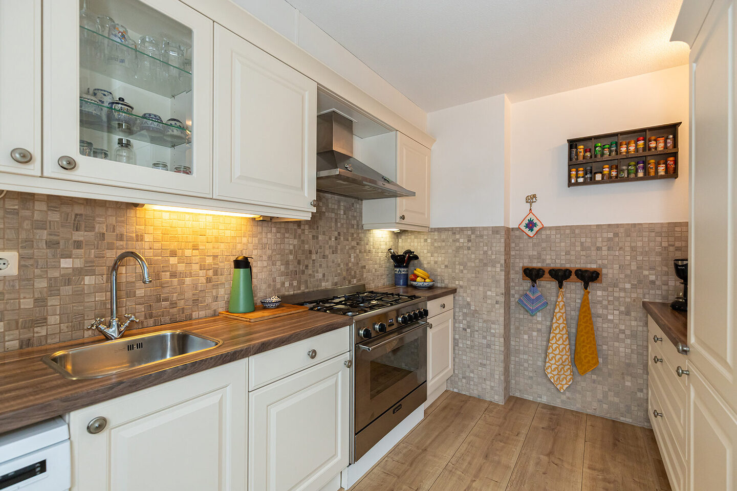 De halfopen keuken aan de achterzijde is praktisch ingedeeld met twee tegenover elkaar geplaatste keukenblokken. Hierdoor ontstaat volop werkruimte en een prettige verbinding met de woonkamer. De keuken is voorzien van diverse inbouwapparatuur, zoals een gasfornuis, afzuigkap, vaatwasser en koelkast, en biedt directe toegang tot de achtertuin.