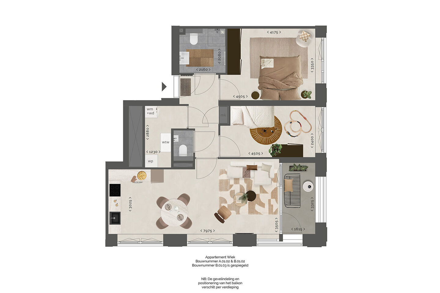 De appartementen van type Wiek bevinden zich op de eerste verdieping van beide gebouwen. Qua architectuur doen deze appartementen mee met de begane grond.