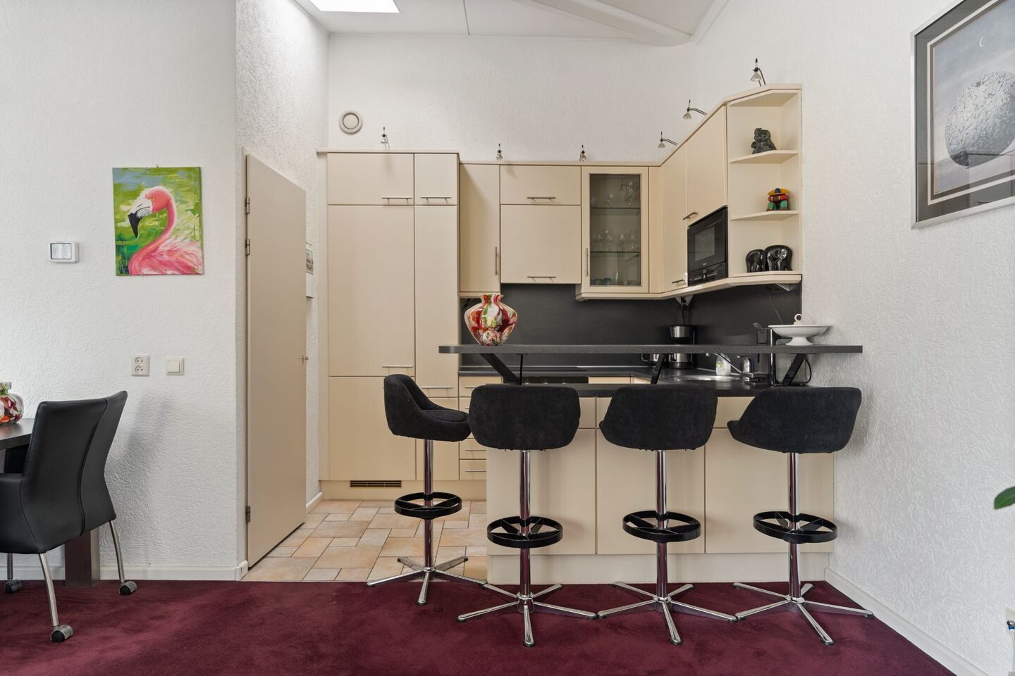 De open keuken met barretje vormt een gezellige plek om te koken en tegelijk contact te houden met de woonkamer. De keukeninrichting bestaat uit vanillekleurige keukenkasten gecombineerd met een zwart, gemêleerd aanrechtblad en de volgende inbouwapparatuur: een inductiekookplaat, een oven, een magnetron, een afzuigkap en een koel-vriescombinatie.