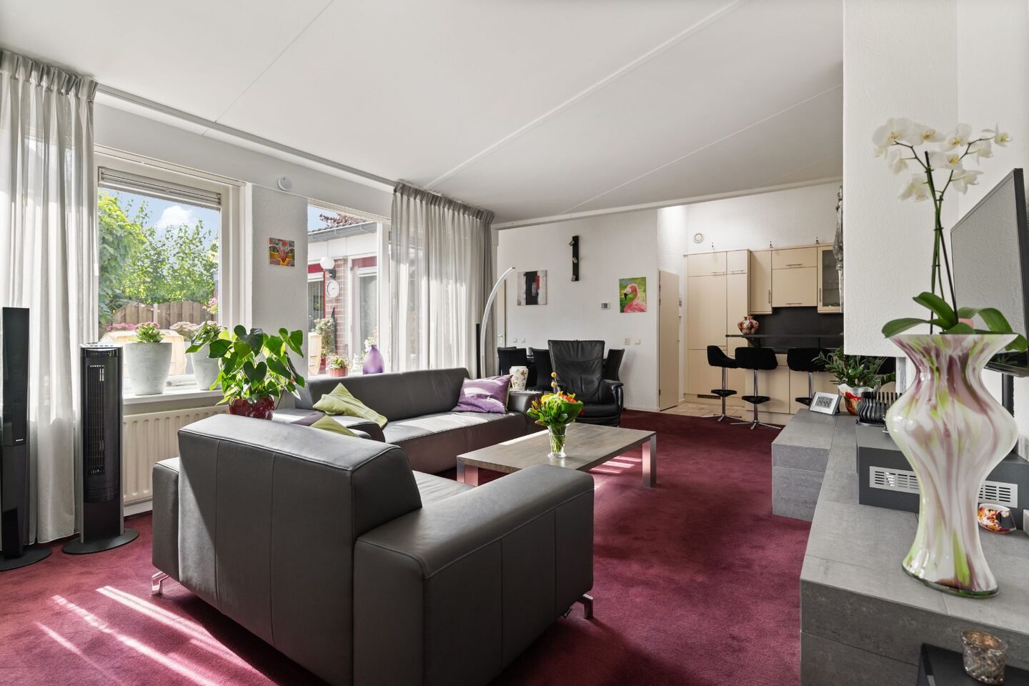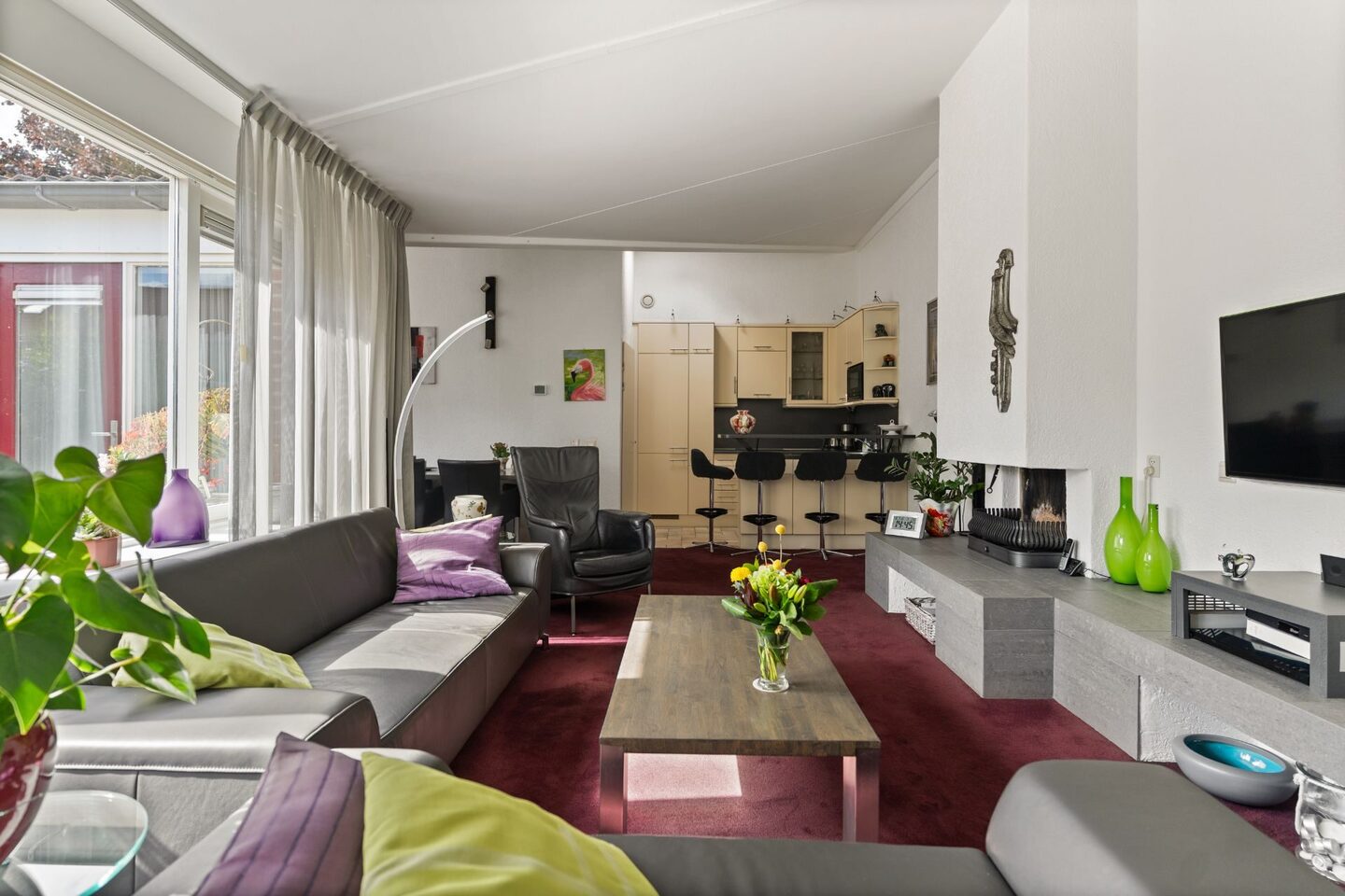 Bij binnenkomst via de hal heb je toegang tot de lichte woonkamer en een aparte kantoorruimte, perfect voor thuiswerken of als hobbykamer. De woonkamer is ruim opgezet, voorzien van een sfeervolle open haard en heeft