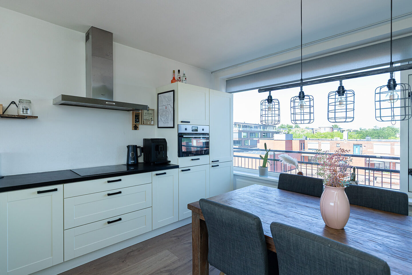 De open keuken is in 2014 geplaatst en uitgevoerd in een praktische L-opstelling in gebroken wit met een stijlvol zwart stenen werkblad. De eetbar maakt het een gezellige plek om te koken, bij te praten of even snel te ontbijten. Natuurlijk is alle benodigde apparatuur aanwezig, en er is ruimte genoeg voor een royale eettafel.