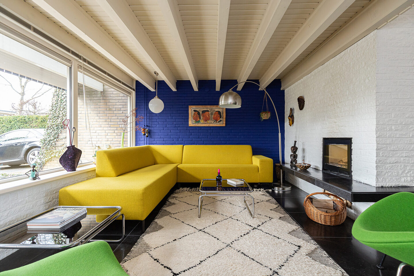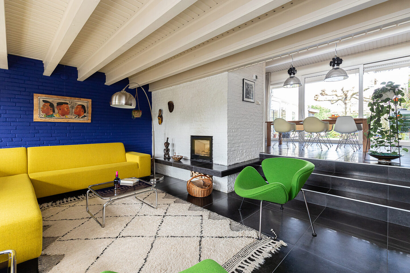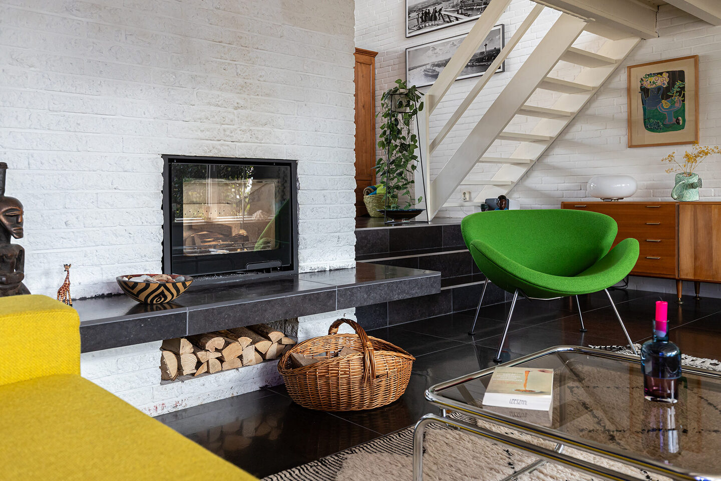 De centrale hal vormt het hart van de woning en valt direct op door de moderne lichtstraat die zorgt voor een aangename, natuurlijke lichtinval. Vanuit hier zijn vrijwel alle vertrekken bereikbaar. De woonkamer ligt aan de voorzijde en bevindt zich op een split-level, wat zorgt voor een speels en ruimtelijk effect. Kamerhoge ramen versterken het gevoel van licht en ruimte, terwijl de houtkachel zorgt voor sfeer en warmte.