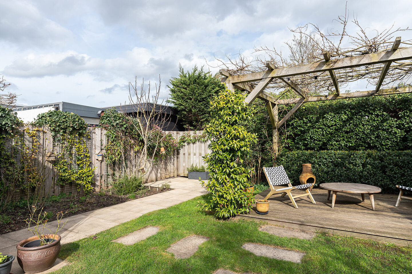 De voortuin op het zuidwesten biedt parkeergelegenheid op eigen terrein en een verzorgde, groene uitstraling. De achtertuin is een echte oase: een combinatie van terras, gazon en volwassen beplanting zorgt voor een natuurlijke, beschutte sfeer. Onder de dakplataan en het prieel vind je altijd een fijne plek in de schaduw of zon. Bovendien beschikt de tuin over een achterom naar de straat aan de achterzijde – een waardevolle en relatief zeldzame toevoeging bij dit type woningen.